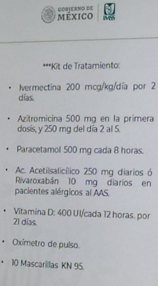 Mexico staat op het punt om Ivermectin-kits in te zetten bij de thuisbehandeling van COVID-19 patiënten. Naast Ivermectine zit in deze kit ook Azitromine, Paracetamol en vitamine D. Het besluit is nog niet formeel gecommuniceerd. Onderstaand een gelekte afbeelding van het document.