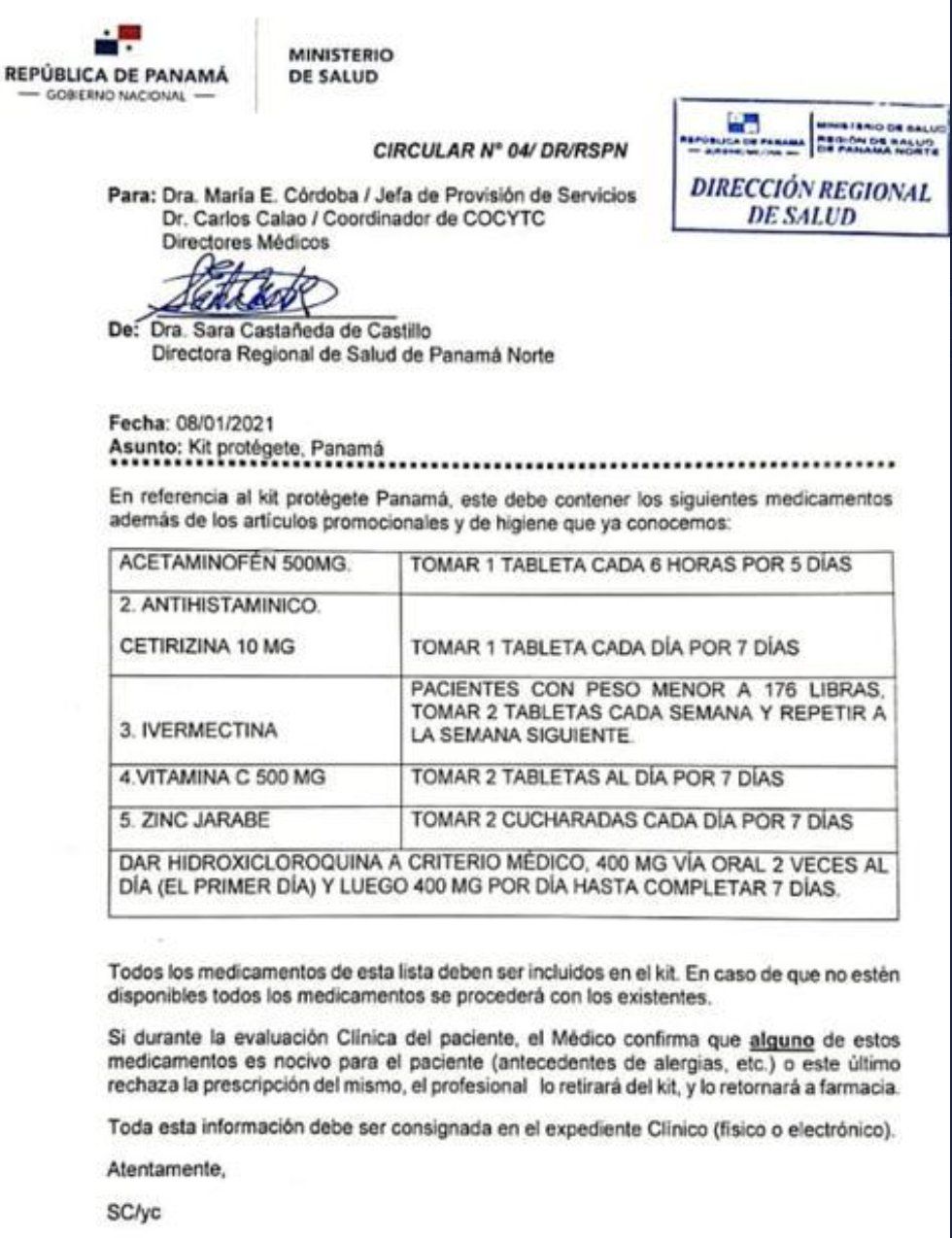 Ook in Noord-Panama zullen COVID-kits met Ivermectine uitgedeeld. Deze bevatten naast Ivermectine onder meer een pijnstiller, vitamine C en Zink. Zie onderstaande afbeeding voor de inhoud van de kit.